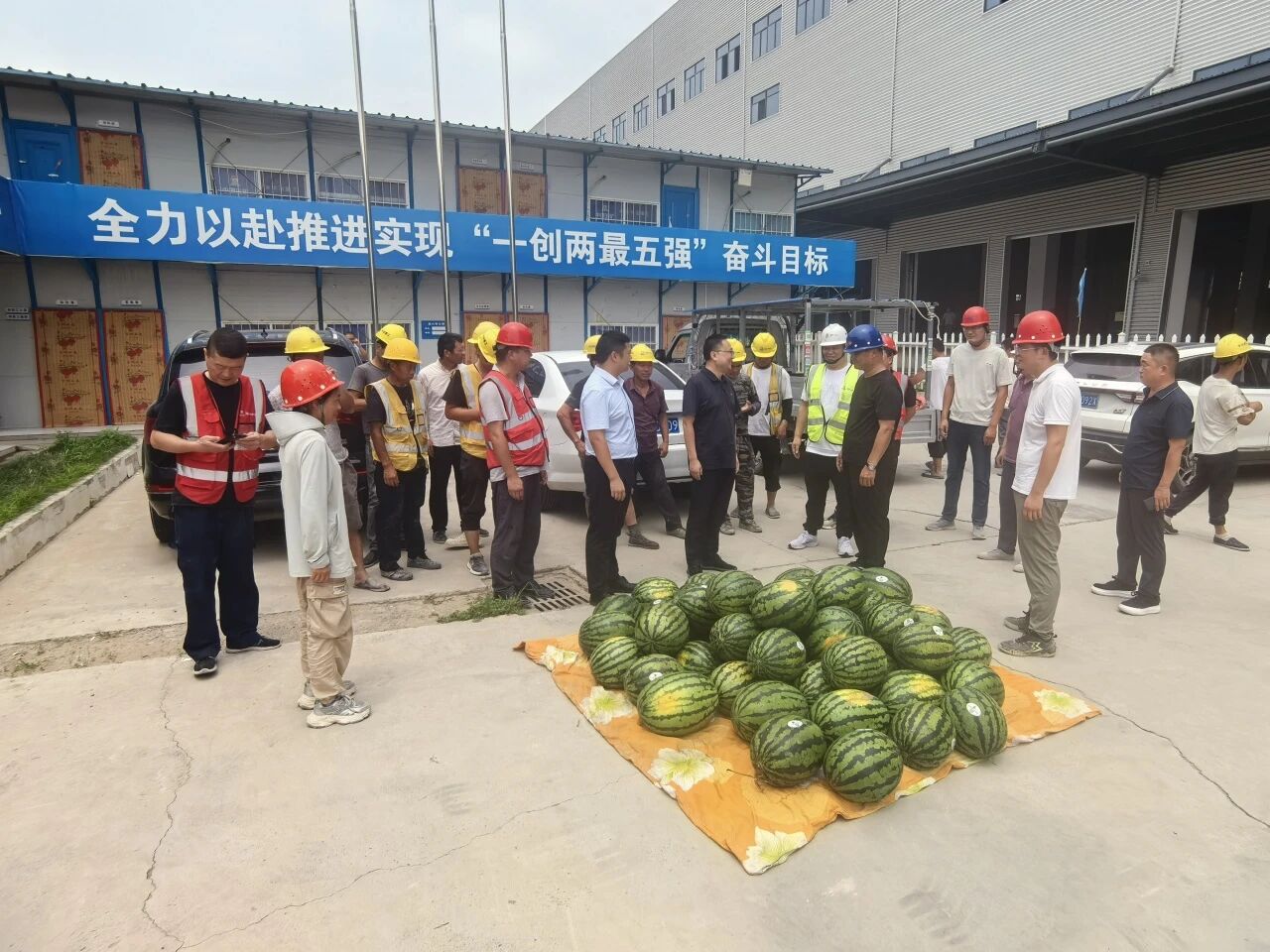 7月8日上午,市場(chǎng)投資公司副總經(jīng)理張航旗、總經(jīng)理助理胡占濤一行前往騰達(dá)項(xiàng)目施工現(xiàn)場(chǎng),慰問(wèn)酷暑作業(yè)中的一線工人并開展項(xiàng)目查看工作,為他們送去西瓜等清涼物資,并就項(xiàng)目建設(shè)問(wèn)題進(jìn)行了交流。